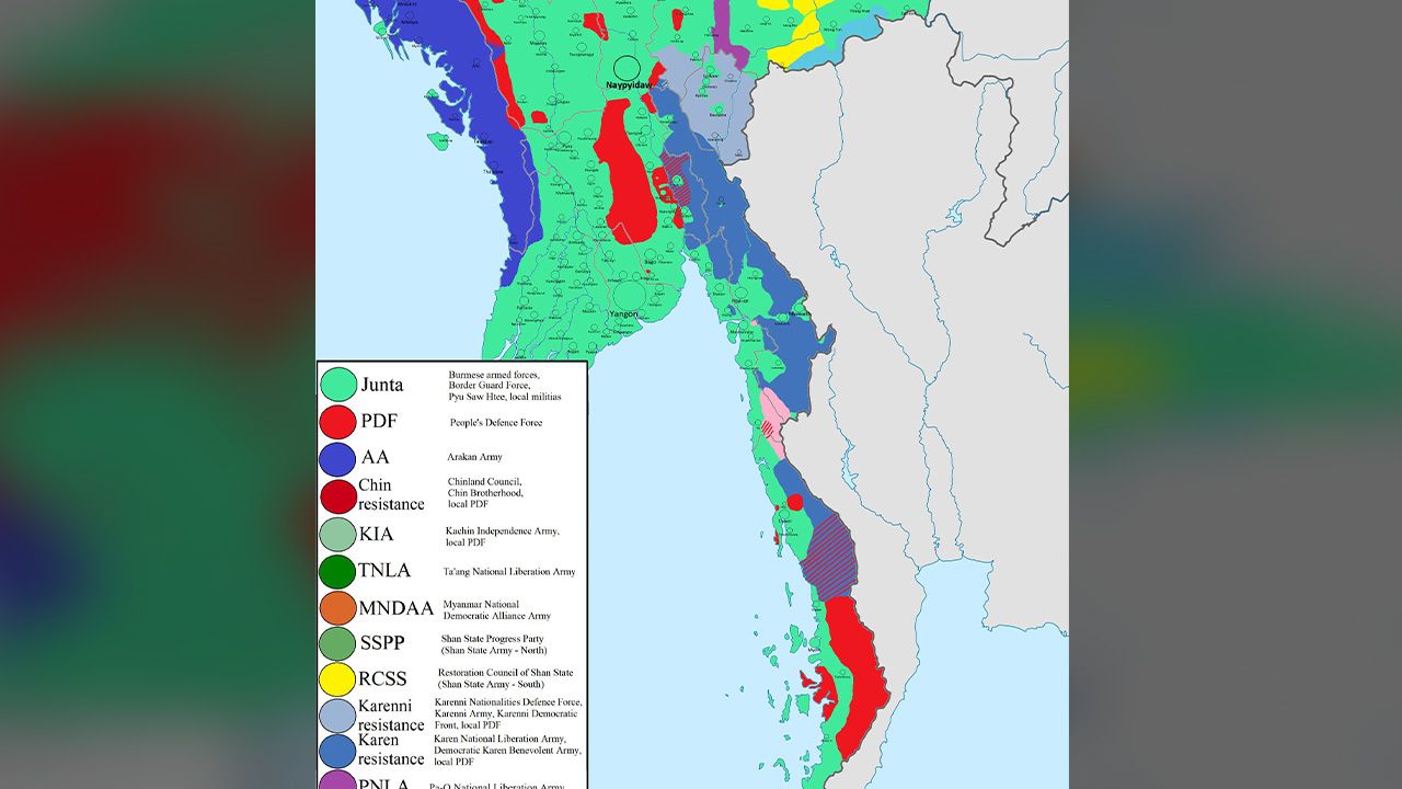 จากรายงานของสำนักข่าวบีบีซี เมื่อปี 2567 กองกำลังทหารเมียนมาสามารถควบคุมพื้นที่ได้เพียงร้อยละ 21 ของประเทศ อีกร้อยละ 42 อยู่ภายใต้การควบคุมของกลุ่มชาติพันธุ์ต่าง ๆ และร้อยละ 29 ยังอยู่ภายใต้การต่อสู้แย่งชิงกัน