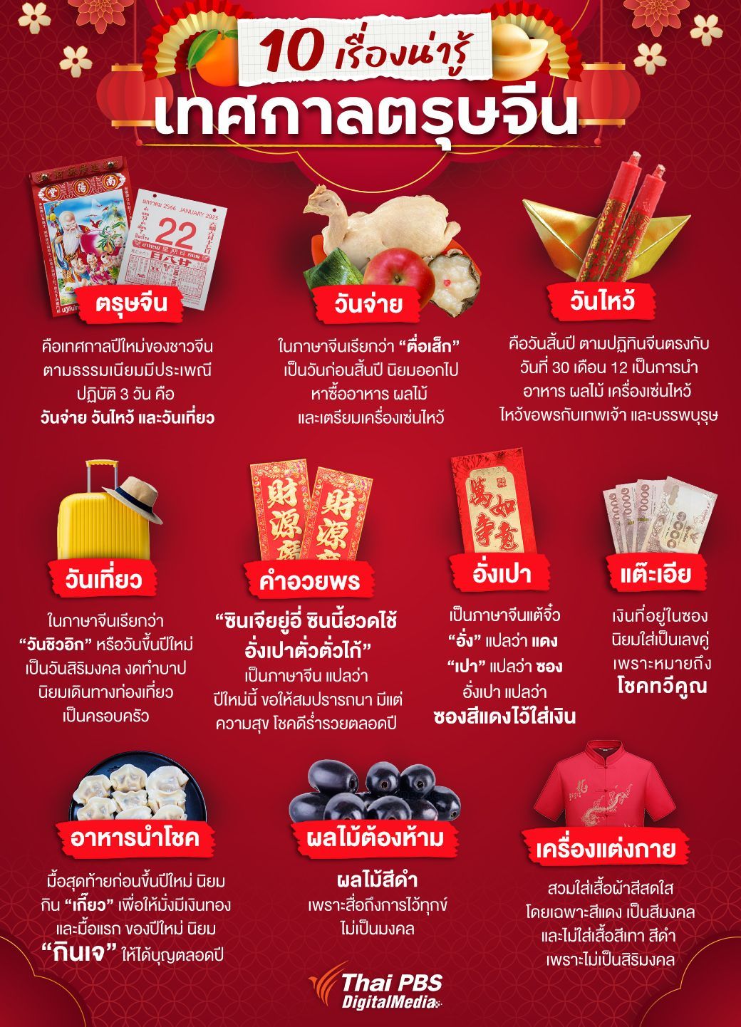 “วันตรุษจีน (Chinese New Year)” เป็นวันขึ้นปีใหม่ของชาวจีน โดยวันแรกเรียกว่า “วันจ่าย” เป็นวันที่คนในครอบครัวออกไปจับจ่ายซื้อของสำหรับไหว้บรรพบุรุษและเฉลิมฉลองปีใหม่ วันรุ่งขึ้นเรียกว่า “วันไหว้” เป็นวันไหว้บรรพบุรุษและเทพเจ้าต่าง ๆ และวันสุดท้ายเรียกว่า “วันเที่ยว” เป็นวันที่คนในครอบครัวไปเยี่ยมญาติมิตรและเฉลิมฉลองปีใหม่ด้วยกัน