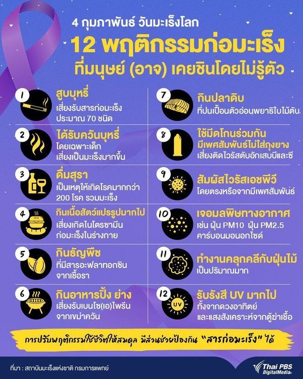 องค์การอนามัยโลก (World Health Organization : WHO) และสมาคมต่อต้านมะเร็งสากล ได้กำหนดให้วันที่ 4 กุมภาพันธ์ ของทุกปีเป็น “วันมะเร็งโลก (World Cancer Day)” เพื่อบรรเทาปัญหาการเจ็บป่วยและเสียชีวิตจากโรคมะเร็ง