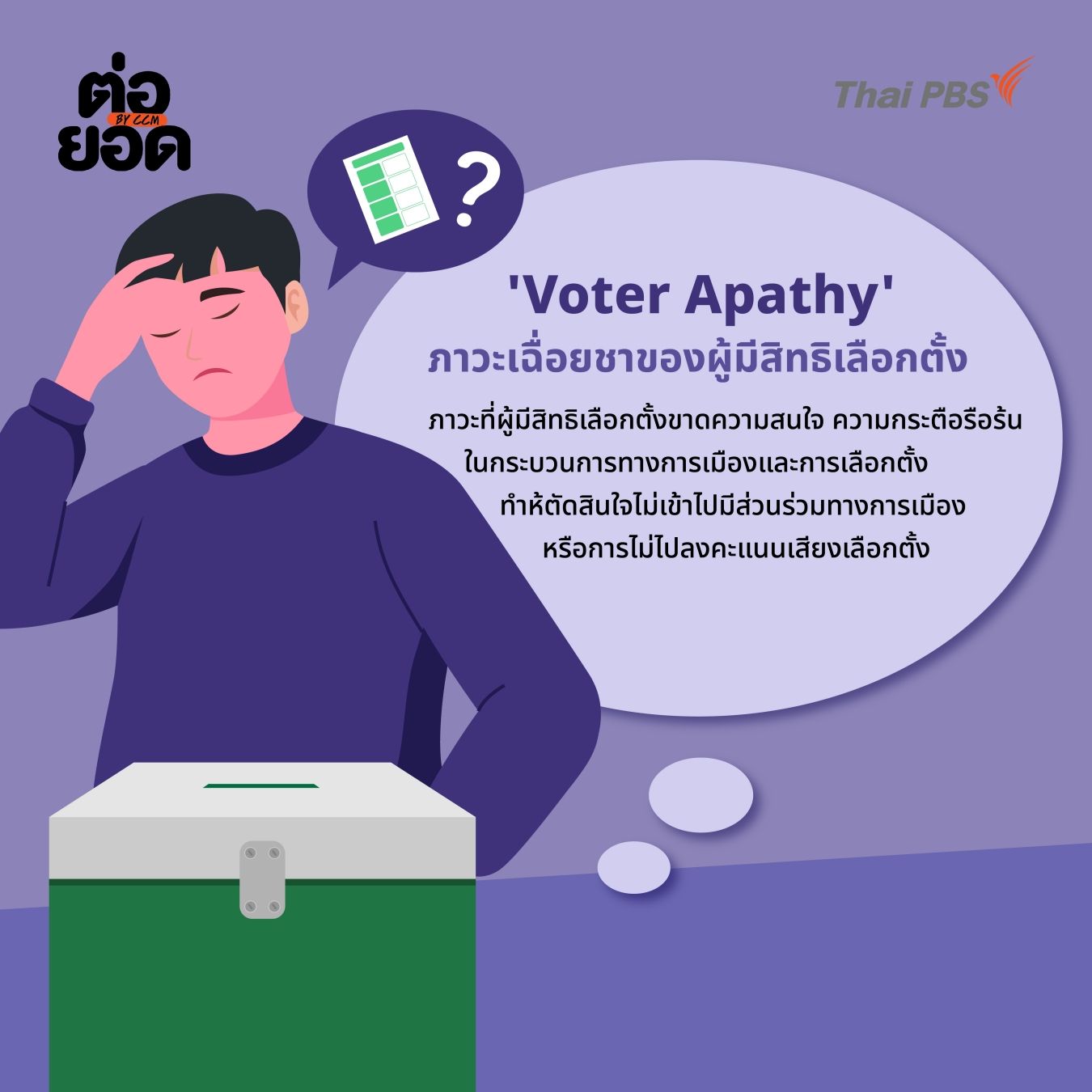 Voter Apathy ความเฉื่อยชาทางการเมือง หรือความรู้สึก "หมดศรัทธา" ที่หลายคนเผชิญอยู่นี้ไม่ใช่เรื่องใหม่ แต่การเลือกตั้ง 2569 ในครั้งนี้ ถือเป็นโอกาสสำคัญที่คนไทยทุกคนจะร่วมกันออกแบบอนาคตที่ตอบโจทย์ชีวิตเราจริง ๆ หากคุณยังลังเลหรือต้องการข้อมูลประกอบการตัดสินใจเกี่ยวกับการเลือกตั้งเพื่อเตรียมความพร้อมก่อนเข้าคูหา สามารถมาร่วมวิเคราะห์ เจาะลึก และติดตามสถานการณ์การเลือกตั้งครั้งสำคัญนี้ไปกับ Thai PBS ที่เว็บไซต์ www.thaipbs.or.th/Election69