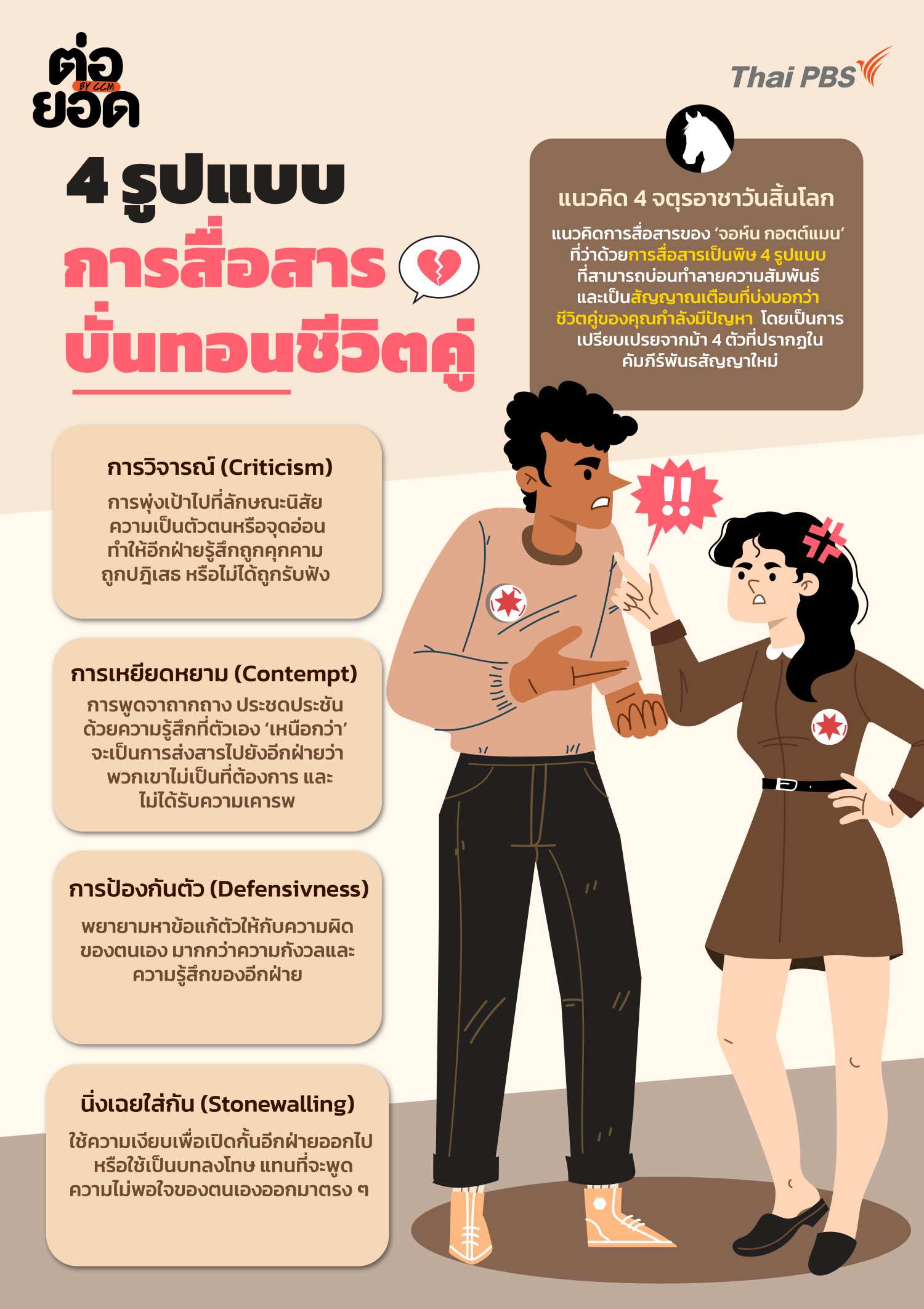 เป็นเรื่องปกติที่ทุก ความสัมพันธ์ จะต้องมีกระทบกระทั่งกันบ้าง และหลายครั้งที่การทะเลาะกันอาจช่วยให้ ชีวิตคู่ ปรับจูนเข้าหากันได้ดีขึ้น แต่สิ่งสำคัญที่ต้องระวังคือ พฤติกรรมการสื่อสาร บางรูปแบบที่อาจเปลี่ยนความขัดแย้งเล็กน้อยให้กลายเป็น ปัญหาชีวิตคู่เรื้อรัง โดยเฉพาะ 4 สัญญาณอันตรายที่ผู้เชี่ยวชาญเตือนว่า หากปล่อยไว้รอยร้าวนี้อาจยากจะเยียวยาจนนำไปสู่การเลิกราได้