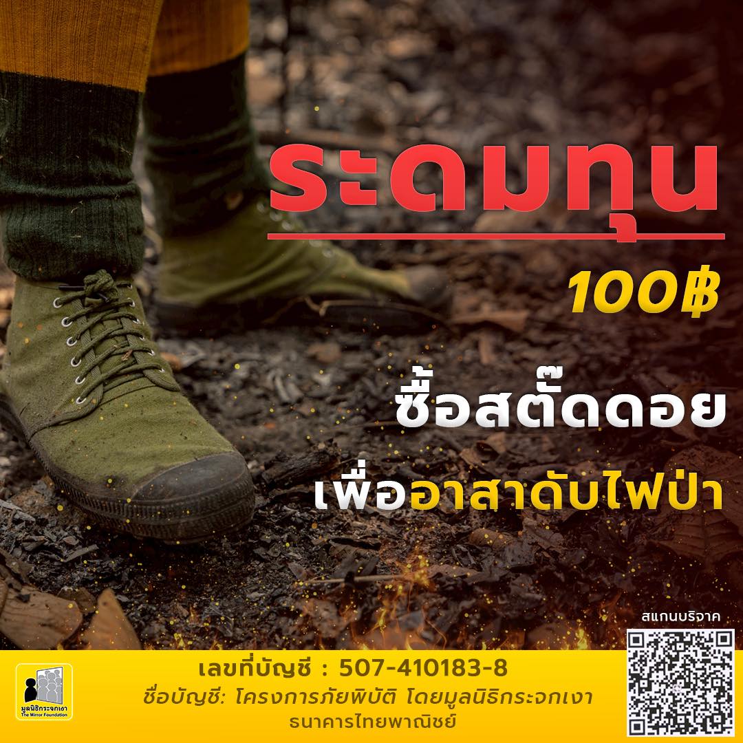 โดยสามารถร่วมเป็นส่วนหนึ่งในการจัดหารองเท้าสตั๊ดดอย เพื่อป้องกันอันตรายให้อาสาดับไฟป่าได้ เข้าไปดูรายละเอียดเพิ่มเติมที่เฟซบุก มูลนิธิกระจกเงา