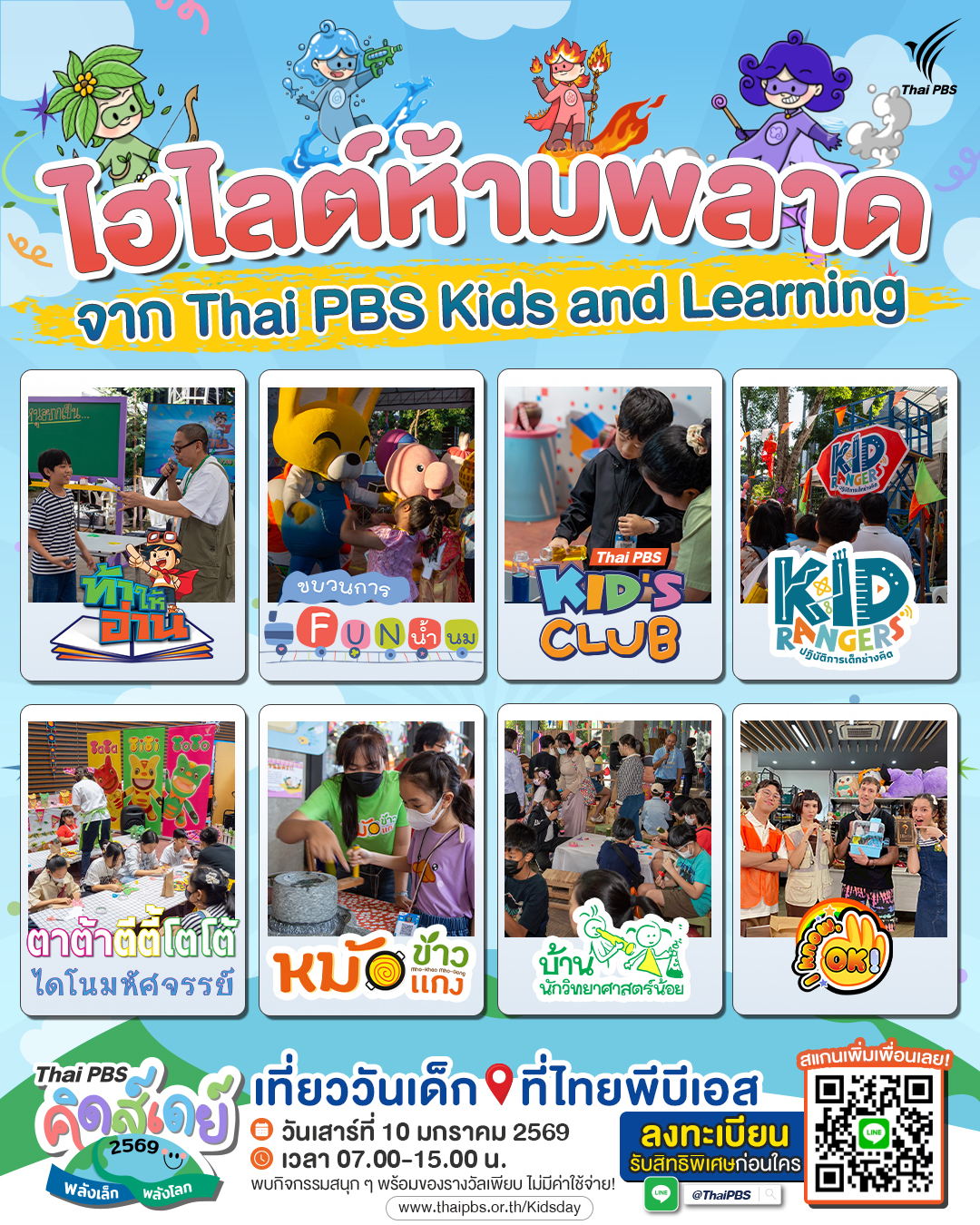 ไทยพีบีเอส เชิญชวนร่วมงาน “Thai PBS คิดส์เดย์ 2569 พลังเล็กพลังโลก” ในวันเสาร์ที่ 10 ม.ค. 69 เปิดพื้นที่แห่งจินตนาการและการผจญภัยให้เด็ก ๆ ได้สวมบทฮีโรจิ๋วพิทักษ์โลก ผ่านกิจกรรมสร้างสรรค์ความรู้ด้านสิ่งแวดล้อม และกิจกรรมที่ช่วยพัฒนาทักษะสมอง (EF) ส่งเสริมทักษะทางสังคม และเสริมสร้างความฉลาดทางอารมณ์