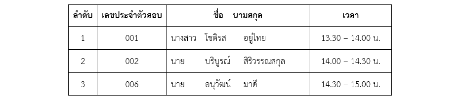 จึงขอแจ้งให้ผู้มีรายชื่อดังกล่าวข้างต้นเข้ารับการสอบสัมภาษณ์ในวันพุธที่ 19 พฤศจิกายน พ.ศ. 2568 เวลา 13.30 – 15.00 น. ณ ห้องประชุม AM 101 ชั้น 1 อาคาร A องค์การกระจายเสียงและแพร่ภาพสาธารณะแห่งประเทศไทย เลขที่ 145 ถนนวิภาวดีรังสิต แขวงตลาดบางเขน เขตหลักสี่ กรุงเทพมหานคร 10210 (โปรดนำบัตรประจำตัวประชาชน และหลักฐานการศึกษาฉบับจริงมาแสดงต่อเจ้าหน้าที่ เพื่อลงทะเบียนก่อนเวลาเข้ารับการสอบสัมภาษณ์ 10 นาที)