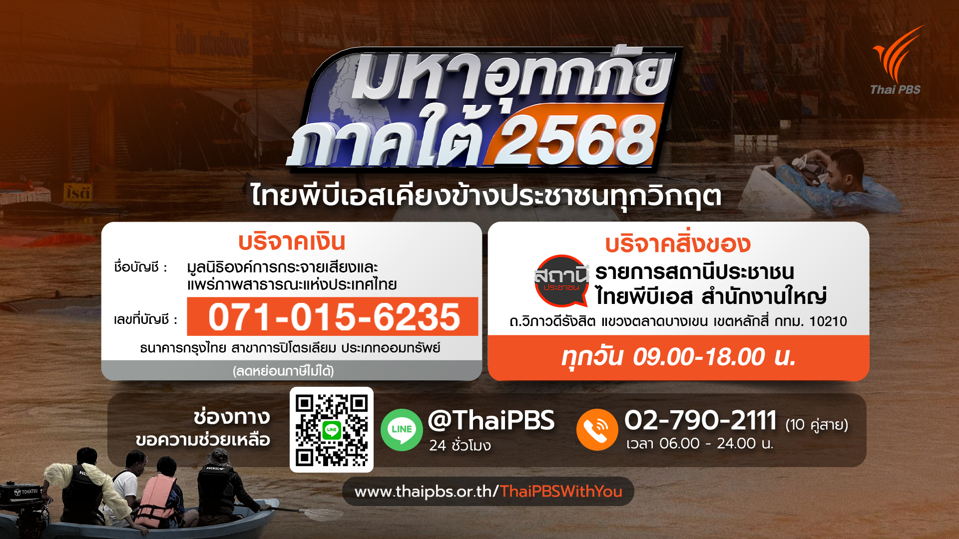 สอบถามรายละเอียดเพิ่มเติมหรือแจ้งความต้องการความช่วยเหลือ ที่ “ศูนย์ประสานความช่วยเหลือ มหาอุทกภัยภาคใต้ 2568” โทร.0 2790 2111 เวลา 06.00 – 24.00 น. หรือทาง LINE: @ThaiPBS และติดตามรายละเอียดเพิ่มเติม ได้ที่ www.thaipbs.or.th/ThaiPBSWithYou