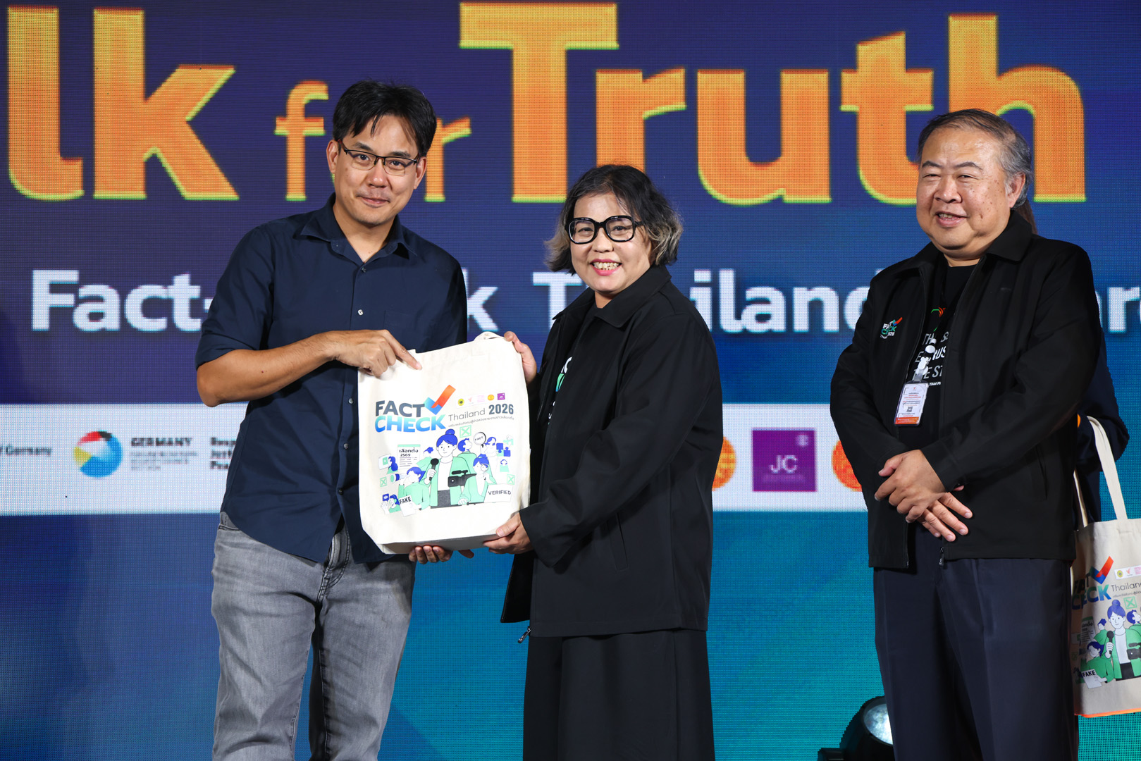 หลังจากนั้นเข้าสู่ช่วง “Talk for Truth” โดย ผู้ทรงคุณวุฒิทั้ง 4 ท่าน อาทิ ศาสตราจารย์พิเศษวิชา มหาคุณ ประธานคณะกรรมการตรวจสอบผลการประเมินคุณธรรมและความโปร่งใสในการดำเนินงานของหน่วยงานภาครัฐ ผู้แทนสำนักงานคณะกรรมการป้องกันและปราบปรามการทุจริตแห่งชาติ, คุณสารี อ่องสมหวัง เลขาธิการสำนักงานสภาผู้บริโภค, คุณยิ่งชีพ อัชฌานนท์ ผู้จัดการโครงการอินเทอร์เน็ตเพื่อกฎหมายประชาชน (iLaw) และคุณประสงค์ เลิศรัตนวิสุทธิ์ ผู้อำนวยการสถาบันอิศรา ที่มาร่วมถ่ายทอดองค์ความรู้ด้านการตรวจสอบข้อมูล ความโปร่งใส และสิทธิของประชาชน ปิดท้ายกับการบรรยายพิเศษในหัวข้อ “Psychological Mechanisms of Disinformation Effects หรือ กลไกทางจิตวิทยาของผลกระทบจากข้อมูลบิดเบือน” โดย Professor Nicole Krämer ศาสตราจารย์ด้านจิตวิทยาสังคม สื่อและการสื่อสาร จาก University of Duisburg-Essen ประเทศเยอรมนี