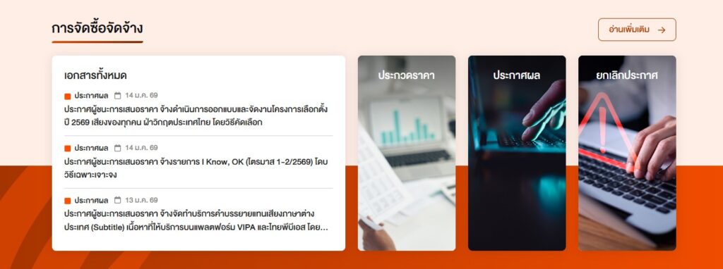 เข้าถึงข้อมูลงานจัดซื้อจัดจ้างได้ง่าย เป็นระบบ ข้อมูลองค์กรแสดงผลอย่างชัดเจน ตรวจสอบได้ สอดคล้องกับบทบาทสื่อสาธารณะ