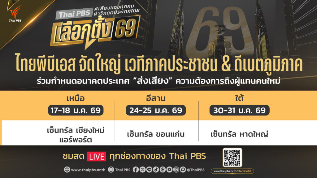 ติดตามชมเวที “ฟังเสียงประชาชน : สร้างบ้านแปงเมือง” ย้อนหลังได้ทาง www.thaipbs.or.th/Election69 และติดตามเวที “ฟังเสียงประชาชน” ครั้งต่อไป ที่จะเดินทางไปฟังเสียงชาวอีสาน จากจังหวัดขอนแก่น ได้ในวันเสาร์ที่ 24 ม.ค. 69