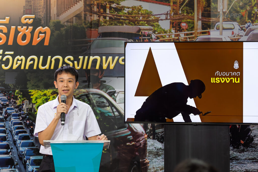 นายศิรพัชร์ เมธีธนวิจิตร์ ตัวแทนนักเรียนโรงเรียนกรุงเทพคริสเตียนวิทยาลัย กล่าวถึง AI กับอนาคตแรงงานว่า หากย้อนกลับไปเมื่อ 2 ปีก่อน AI ยังถูกมองเป็นเพียงเครื่องมือค้นหาข้อมูล แต่ปัจจุบันได้เข้ามามีบทบาทอย่างกว้างขวาง ทั้งในด้านการศึกษาและชีวิตประจำวัน ในยุคปัจจุบันการเก่งเพียงอย่างเดียวไม่เพียงพอ จำเป็นต้องมีทักษะการใช้ AI ซึ่งมีบทบาทในหลากหลายรูปแบบงาน แม้จะมีโอกาสที่ AI จะเข้ามาแทนที่แรงงานบางส่วน แต่ไม่สามารถทดแทนมนุษย์ได้ 100%