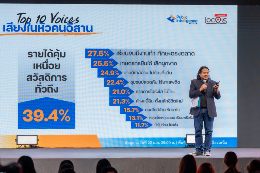 ไทยพีบีเอส เปิดพื้นที่ฟังเสียงคนอีสาน สะท้อนปัญหา ชี้ทางออก ร่วมออกแบบฉากทัศน์อนาคตของภาคอีสานในอีก 5 ปีข้างหน้า บนเวที “ฟังเสียงประชาชนอีสาน : เบิ่งให้ซอด ฮู้ให้ลึก” ระดมความคิดเห็นจากคนทุกรุ่น พบ ความเหลื่อมล้ำ 7 มิติ ปัญหาปากท้องยังคงเป็นประเด็นหลัก พร้อมฉายภาพอนาคต “อีสานอุกอั่งเอ้า” ฝันร้ายของคนอีสาน หากไม่มีการแก้ไขปัญหา