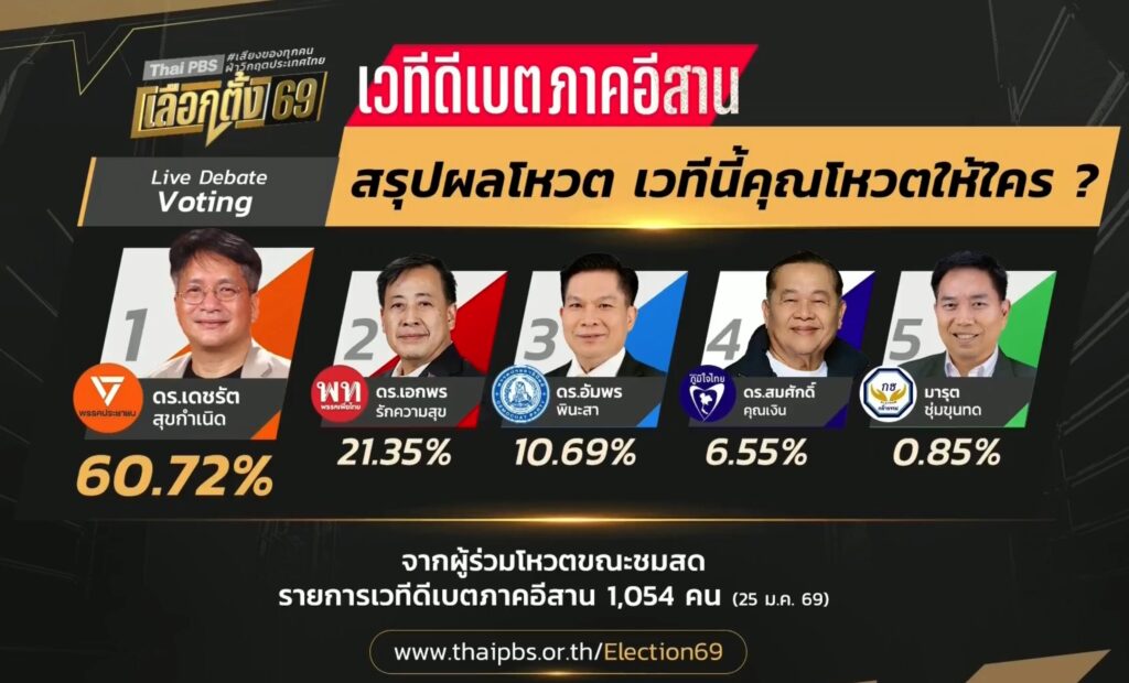 สำหรับผลการโหวต Live Debate Voting จากผู้ชมทั้งในเวทีและออนไลน์ในการถ่ายทอดสด “ดีเบตภาคอีสาน เลือกตั้ง 69” พบว่า พรรคประชาชนได้รับคะแนนสูงสุด 60.72% ตามด้วย พรรคเพื่อไทย 21.35%, พรรคประชาธิปัตย์ 10.69%, พรรคภูมิใจไทย 6.55%, และพรรคกล้าธรรม 0.85%