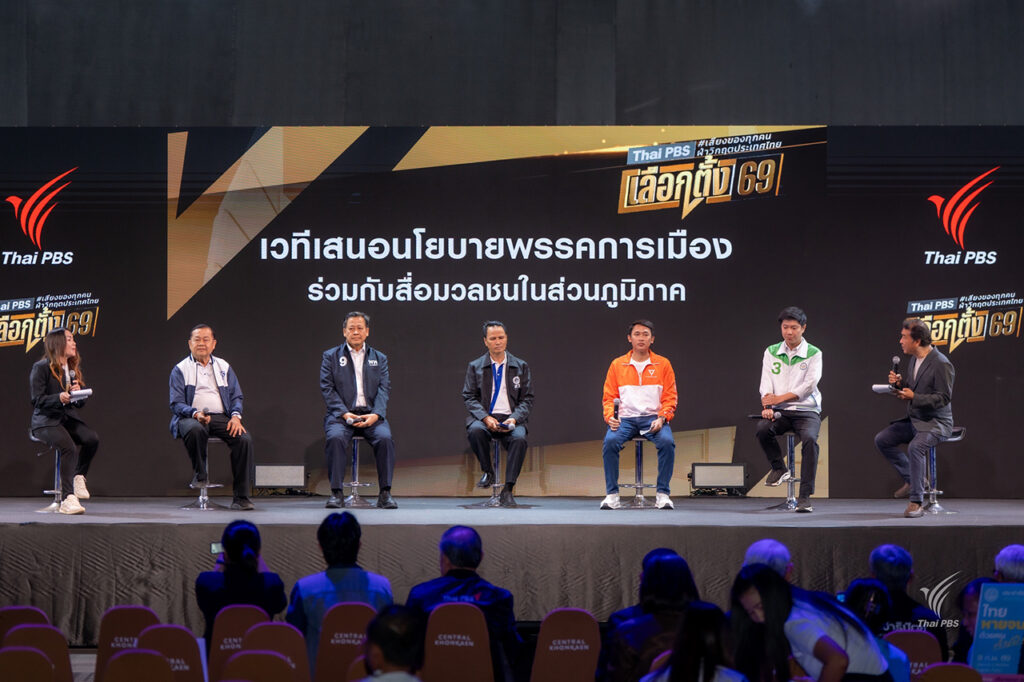 ไทยพีบีเอส และเครือข่ายสื่อมวลชนภาคอีสาน ร่วมกัน จัดเวทีประชันนโยบายพรรคการเมือง สู่การแก้ปัญหาเชิงพื้นที่ สะท้อนความจริงจากขอนแก่น ที่ยังเผชิญปัญหาเดิม ๆ ทั้งหนี้ น้ำท่วม น้ำแล้ง ความเหลื่อมล้ำ และสิทธิมนุษยชน 5 พรรคการเมืองใหญ่ ร่วมถก โชว์วิสัยทัศน์ หาทางออกแก้ปัญหา