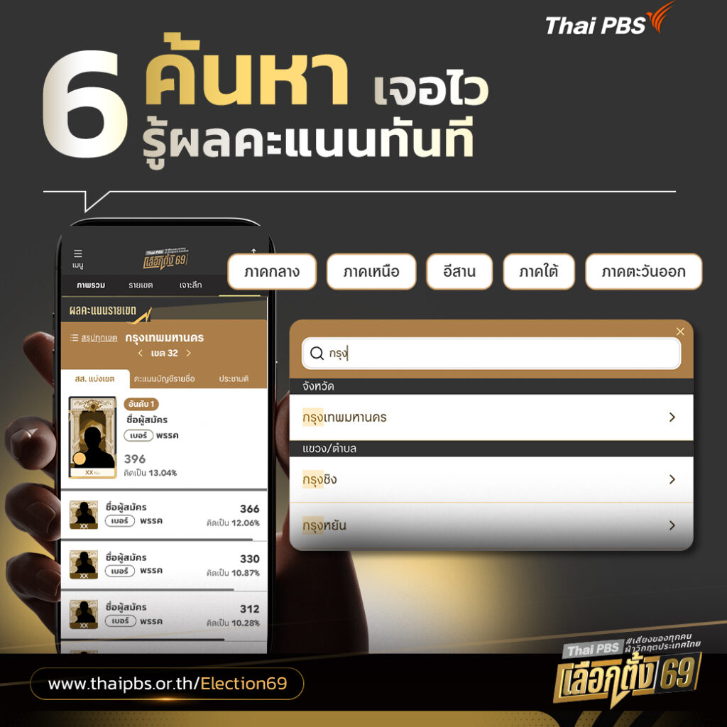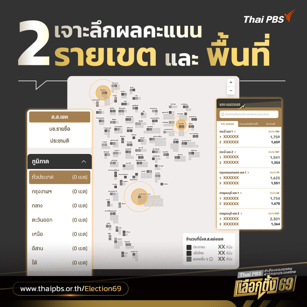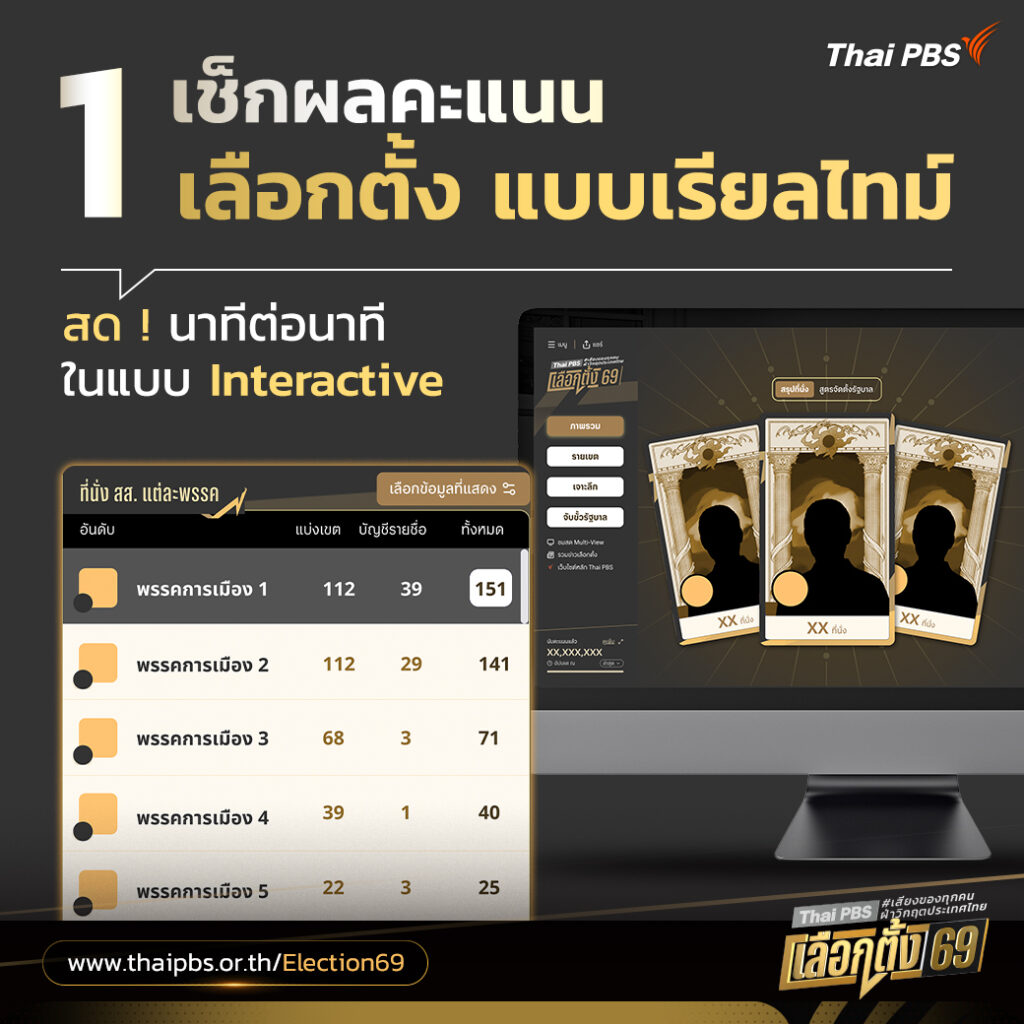1.เช็กผลคะแนนเลือกตั้งแบบเรียลไทม์ การรายงานผลคะแนนเลือกตั้ง (อย่างไม่เป็นทางการ) ในมิติต่าง ๆ สดนาทีต่อนาที ร่วมลุ้นผลการเลือกตั้งแบบ Interactive รองรับทุกอุปกรณ์