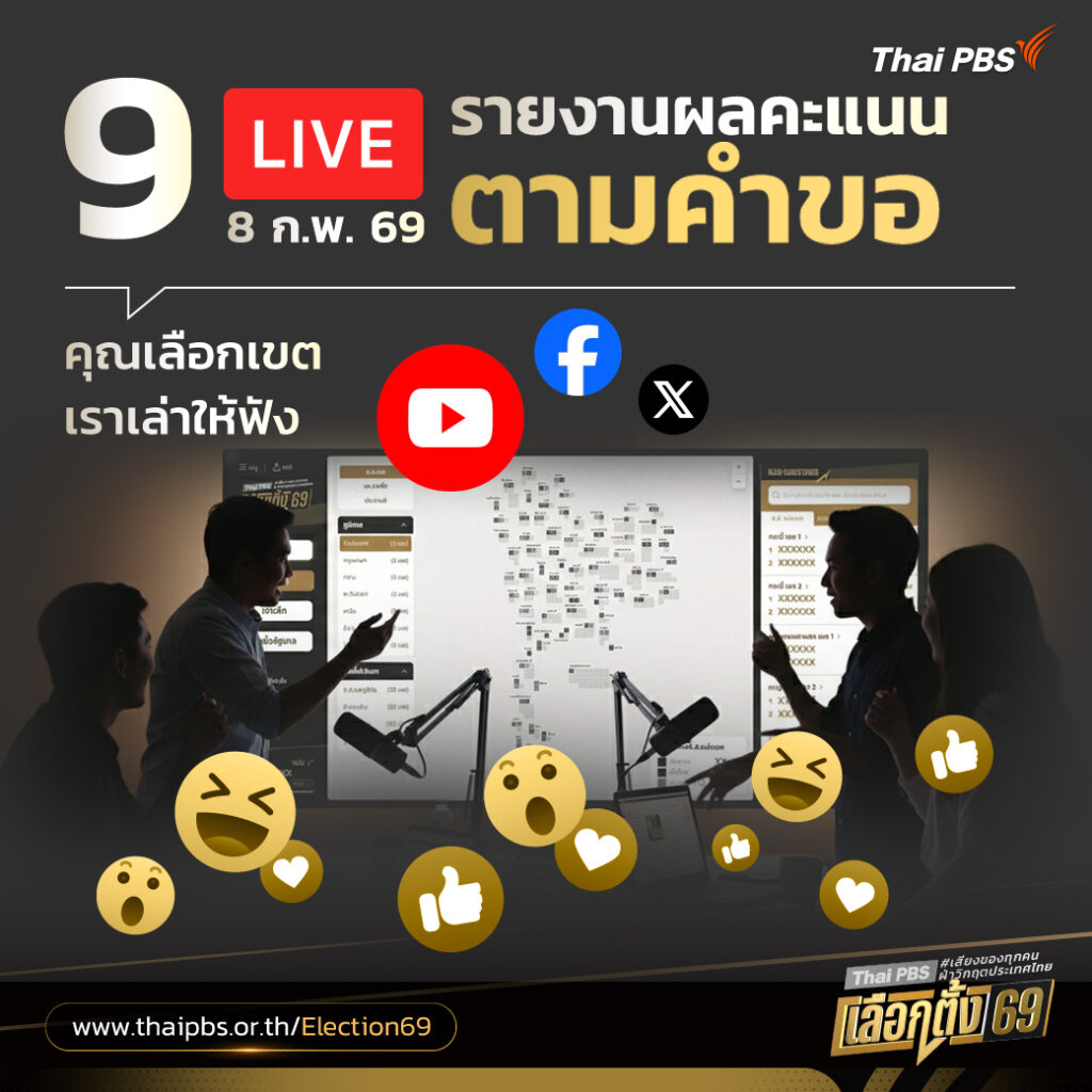 สามารถติดตามผลคะแนนการเลือกตั้งแบบเรียลไทม์ได้ในวันอาทิตย์ที่ 8 กุมภาพันธ์ 2569 ตั้งแต่เวลา 17.00 เป็นต้นไป ทางเว็บไซต์ www.thaipbs.or.th/Election69 เกาะติดเลือกตั้ง 2569 ได้ทางไทยพีบีเอส ช่องหมายเลข 3 และทุกช่องทางออนไลน์