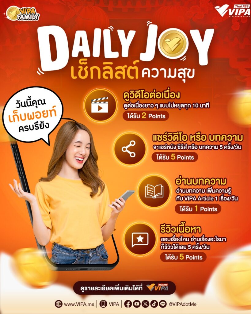 จากยอดการเติบโตของสมาชิกใหม่บน VIPA ตลอดปี 2568 ที่เพิ่มขึ้นกว่า 235.17% ไทยพีบีเอสเดินหน้าพัฒนาแพลตฟอร์มสตรีมมิ่ง VIPA ทุกความสุข… ดูฟรี ไม่มีโฆษณา อย่างต่อเนื่อง พร้อมยกระดับประสบการณ์การรับชมและการตอบแทนผู้ชม ด้วยการเปิดตัวฟีเจอร์ใหม่ “VIPA Family” บนแอปพลิเคชัน VIPA ที่ต่อยอดจากแพลตฟอร์มรับชมคอนเทนต์ สู่พื้นที่แห่งการมีส่วนร่วมของผู้ชมในยุคดิจิทัล เริ่มต้นด้วยแคมเปญ “แจกอั่งเปา ส่งความสุข” ตลอดเดือนกุมภาพันธ์ 2569 ภายใต้แนวคิด “ยิ่งดู ยิ่งได้” เพื่อสร้างแรงจูงใจและสีสันให้ผู้ชมร่วมกิจกรรมบนแพลตฟอร์ม พร้อมเติมความสนุกให้การรับชมมากยิ่งขึ้น