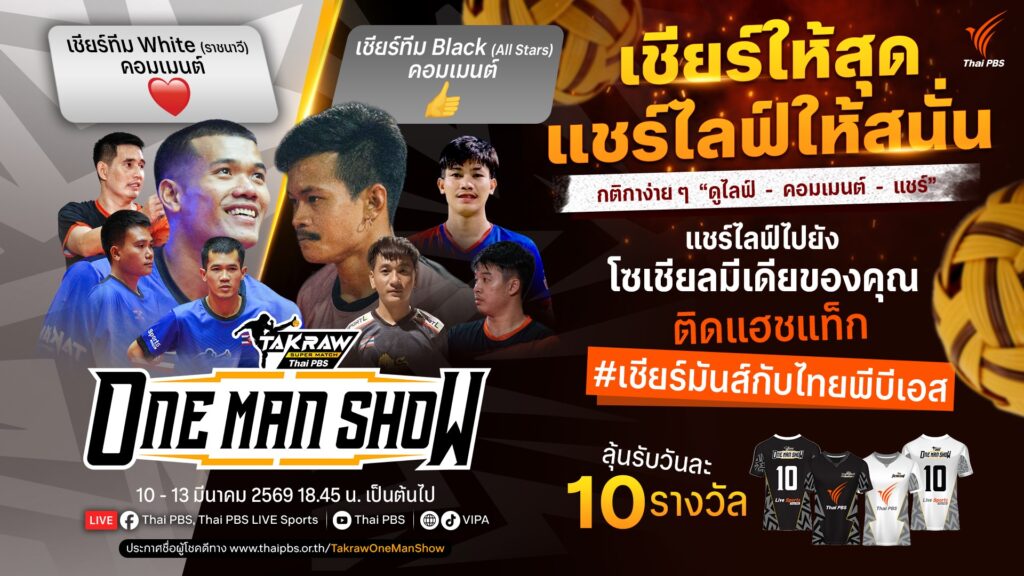 มีนาคม 2569 ไทยพีบีเอสเปิดศึกความมันส์กับการแข่งขันกีฬาตะกร้อระดับประเทศ ในรายการ “Takraw Super Match Thai PBS ONE MAN SHOW 2026” โดย ไทยพีบีเอส ร่วมกับ สมาคมกีฬาตะกร้ออาวุโสไทยในพระราชูปถัมภ์ จัดการแข่งขันสุดเข้มข้น รวมสุดยอดนักเตะตะกร้อฝีเท้าจัดจ้านจากทั่วประเทศ มาประชันลีลาลูกฟาดแบบตัวต่อตัว ปีนี้การแข่งขันกลับมาพร้อมกติกาใหม่ที่เร้าใจกว่าเดิม เพิ่มดีกรีความตื่นเต้นในทุกจังหวะการเล่น ให้แฟนกีฬาร่วมลุ้นไปกับทุกลูกเสิร์ฟ ทุกจังหวะฟาดตลอดเกมที่คาดเดาผลไม่ได้