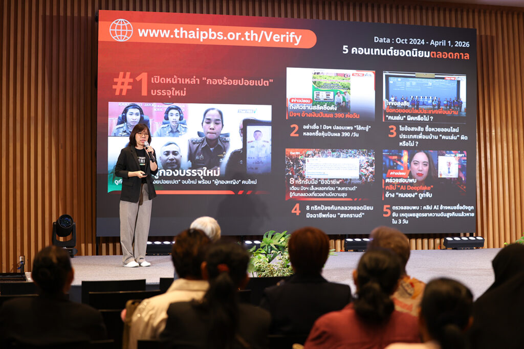 เมื่อวันที่ 2 เมษายน 2569 เนื่องในวันตรวจสอบข่าวลวงโลก องค์การกระจายเสียงและแพร่ภาพสาธารณะแห่งประเทศไทย หรือ ไทยพีบีเอส โดย Thai PBS Verify ร่วมเป็นส่วนหนึ่งบนเวทีเสวนา Lost In Information when disinformation becomes a global risk เมื่อข้อมูลลวง กลายเป็นความเสี่ยงโลก จัดโดย โคแฟค (ประเทศไทย) ร่วมกับภาคีเครือข่ายอื่น ๆ ที่ได้รับรองมาตรฐานจาก IFCN ณ ห้องเอนกประสงค์ชั้น 1 หอศิลปวัฒนธรรมแห่งกรุงเทพมหานคร โดย คุณกนกพร ประสิทธิ์ผล ผู้อำนวยการสำนักสื่อดิจิทัล ไทยพีบีเอส ร่วมบรรยายในหัวข้อ “ไฮไลต์ข่าวลวงในรอบปีและก้าวต่อไป” ที่ยังคงทวีความซับซ้อน ส่งผลกระทบในวงกว้าง ทั้งในมิติของสังคม เศรษฐกิจ และความเชื่อมั่นของประชาชน พร้อมชี้ให้เห็นบทบาทสำคัญของสื่อสาธารณะและภาคีเครือข่ายในการร่วมกันตรวจสอบข้อเท็จจริง สร้างภูมิคุ้มกันทางข้อมูล ขับเคลื่อนสังคมให้เท่าทันข่าวลวงอย่างยั่งยืนในอนาคต