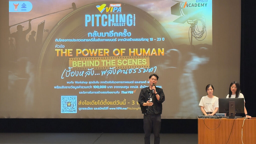 ช่วงท้ายของกิจกรรมครั้งนี้ ไทยพีบีเอสยังได้ร่วมประชาสัมพันธ์โครงการ “VIPA Pitching Project 2026” ซึ่งเปิดโอกาสให้คนรุ่นใหม่ นักศึกษา ส่งไอเดียสารคดีและเนื้อหาสร้างสรรค์ เพื่อพัฒนาสู่การผลิตจริง ในหัวข้อ “The Power of Human: Behind the Scenes” เบื้องหลัง… พลังคนธรรมดา” โดยผู้เข้าร่วมโครงการจำนวน 20 ทีมที่ผ่านการคัดเลือก จะได้พัฒนาผลงานสารคดีสั้นความยาว 10 – 15 นาที พร้อมโอกาสเผยแพร่ผ่านแพลตฟอร์ม VIPA และชิงรางวัลรวมมูลค่ากว่า 100,000 บาท รวมถึงโอกาสต่อยอดผลงานร่วมกับไทยพีบีเอสในอนาคต ผู้สนใจสามารถสมัครเข้าร่วมโครงการได้ตั้งแต่วันนี้ – 3 พฤษภาคม 2569 และศึกษารายละเอียดเพิ่มเติมได้ที่ www.VIPA.me/PitchingProject2026