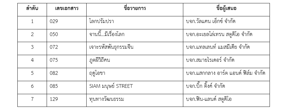 มีรายการที่ผ่านการคัดสรร จำนวน 7 รายการ รายการที่ไม่ผ่านการคัดสรร จำนวน 128 รายการ โดยมีรายชื่อรายการที่ผ่านการคัดสรร ดังนี้