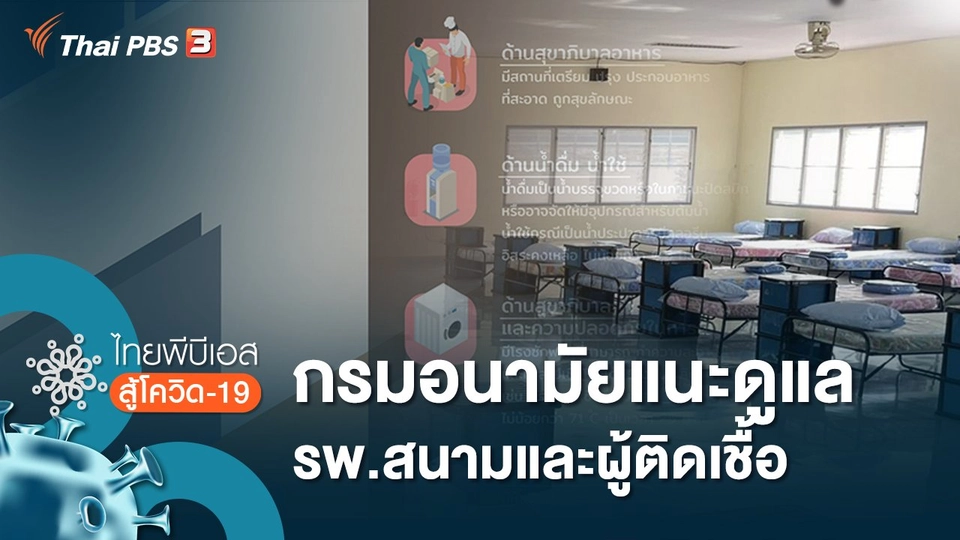 12:00ไทยพีบีเอสสู้โควิด-19กรมอนามัยแนะดูแล รพ.สนามและผู้ติดเชื้อพบกับประเด็นกรมอนามัย แนะการจัดการสิ่งแวดล้อม รพ.สนามและผู้ติดเชื้อการจัดการชุมชนหอพักแรงงาน จ.ลำพูน การจัดการ "คุมโรค" ในชุมชนชมย้อนหลัง2 ชั่วโมง