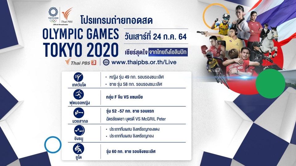 14:00ติดลิขสิทธิ์รับชมย้อนหลังไม่ได้Olympic Gamesเทควันโด มวยสากลไทยพีบีเอสถ่ายทอดสด Olympic Games Tokyo 2020 การแข่งขันเทควันโด ฟุตบอลหญิง มวยสากล ยิงธนู และยูโด