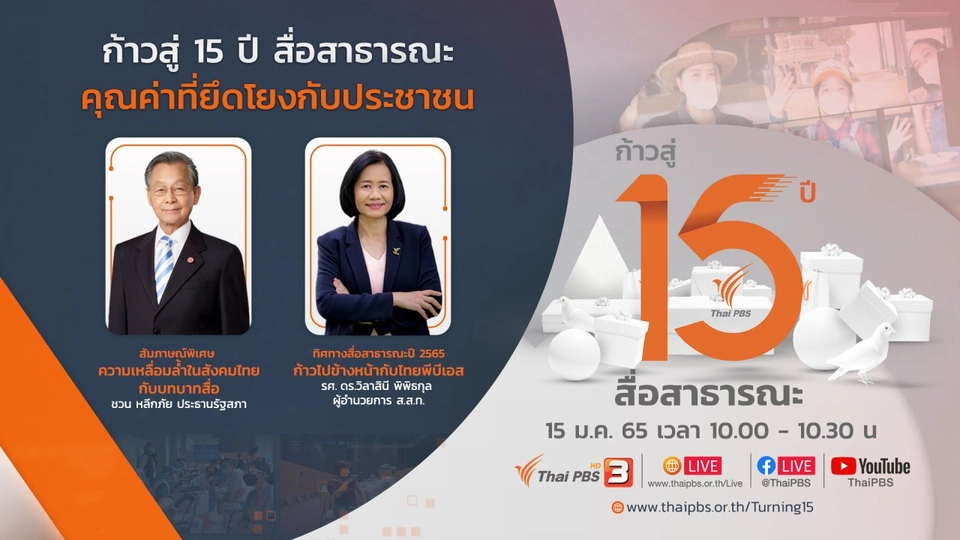 13:45เปิดบ้าน Thai PBSรับฟังข้อเสนอแนะ ติชม จากผู้ชมทางบ้าน และชวนคุณผู้ชม "รู้เท่าทันสื่อ" ผ่านเบื้องหลังการทำงานของสื่อสาธารณะชมย้อนหลัง15 นาที