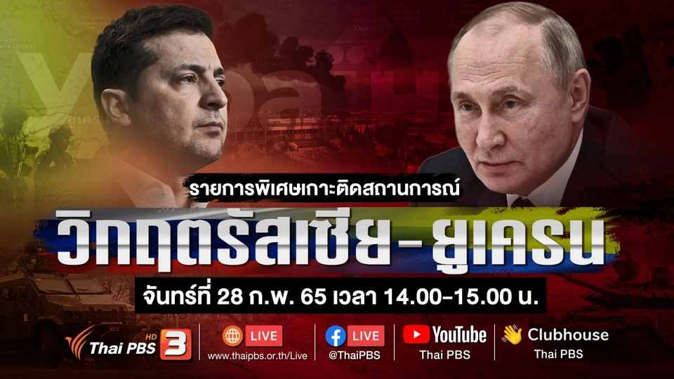21:00ทันโลก กับ ที่นี่ Thai PBSประเด็นข่าว (28 ก.พ. 65)พบกับประเด็นรัสเซีย - ยูเครนเปิดฉากหารือสยบความขัดแย้งสมัชชาใหญ่สหประชาชาติเตรียมประชุมฉุกเฉินเรื่องยูเครนชมย้อนหลัง45 นาที