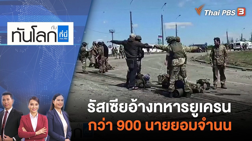 21:00ทันโลก กับ ที่นี่ Thai PBSรัสเซียอ้างทหารยูเครนกว่า 900 นายยอมจำนน | ทันโลก กับ ที่นี่ Thai PBS | 18 พ.ค. 65พบกับประเด็นรัสเซียอ้างทหารยูเครนกว่า 900 นายยอมจำนนแมคโดนัลด์ถอนธุรกิจจากรัสเซียชมย้อนหลัง45 นาที
