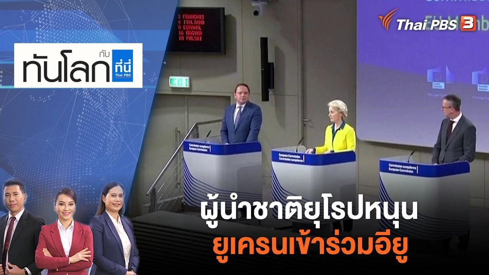 21:30ทันโลก กับ ที่นี่ Thai PBSผู้นำชาติยุโรปหนุนยูเครนเข้าร่วมอียู | ทันโลก กับ ที่นี่ Thai PBS | 17 มิ.ย. 65พบกับประเด็นผู้นำชาติยุโรปหนุนยูเครนเข้าร่วมอียูอินเดียเดินหน้าแผนปรับโครงสร้างกองทัพชมย้อนหลัง45 นาที
