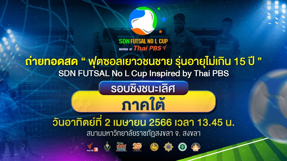 14:05SDN FUTSAL No L Cup Inspired by Thai PBSรอบชิงชนะเลิศ ภาคใต้มาร่วมเชียร์ฟุตซอลเยาวชนชายอายุไม่เกิน 15 ปี รายการ SDN FUTSAL No L Cup Inspired by THAIPBS รอบชิงชนะเลิศ ภาคใต้ชมย้อนหลัง1 ชั่วโมง 55 นาที