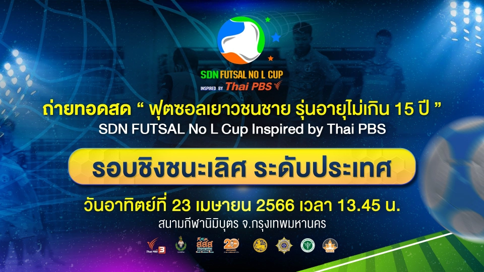 14:05SDN FUTSAL No L Cup Inspired by Thai PBSรอบชิงชนะเลิศ ระดับประเทศมาร่วมเชียร์ฟุตซอลเยาวชนชายอายุไม่เกิน 15 ปี รายการ SDN FUTSAL No L Cup Inspired by THAIPBS รอบชิงชนะเลิศ ระดับประเทศชมย้อนหลัง1 ชั่วโมง 55 นาที