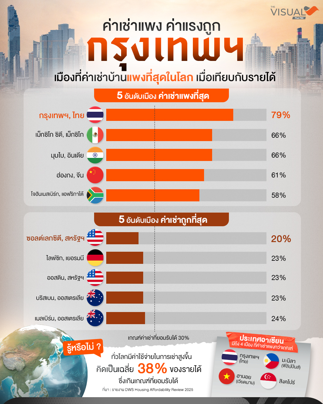จากรายงาน DWS Housing Affordability Review 2025 สำรวจการจ่ายค่าเช่าที่อยู่อาศัย 80 เมืองทั่วโลก โดยวัดจากอัตราส่วนค่าเช่าต่อรายได้ และกำลังซื้อคงเหลือหลังหักค่าเช่า พบว่า โดยรวมทั่วโลกมีค่าใช้จ่ายในการเช่าสูงขึ้น คิดเป็นเฉลี่ย 38% ของรายได้ เกินกว่าเกณฑ์ที่ยอมรับได้ที่อยู่ที่ 30%