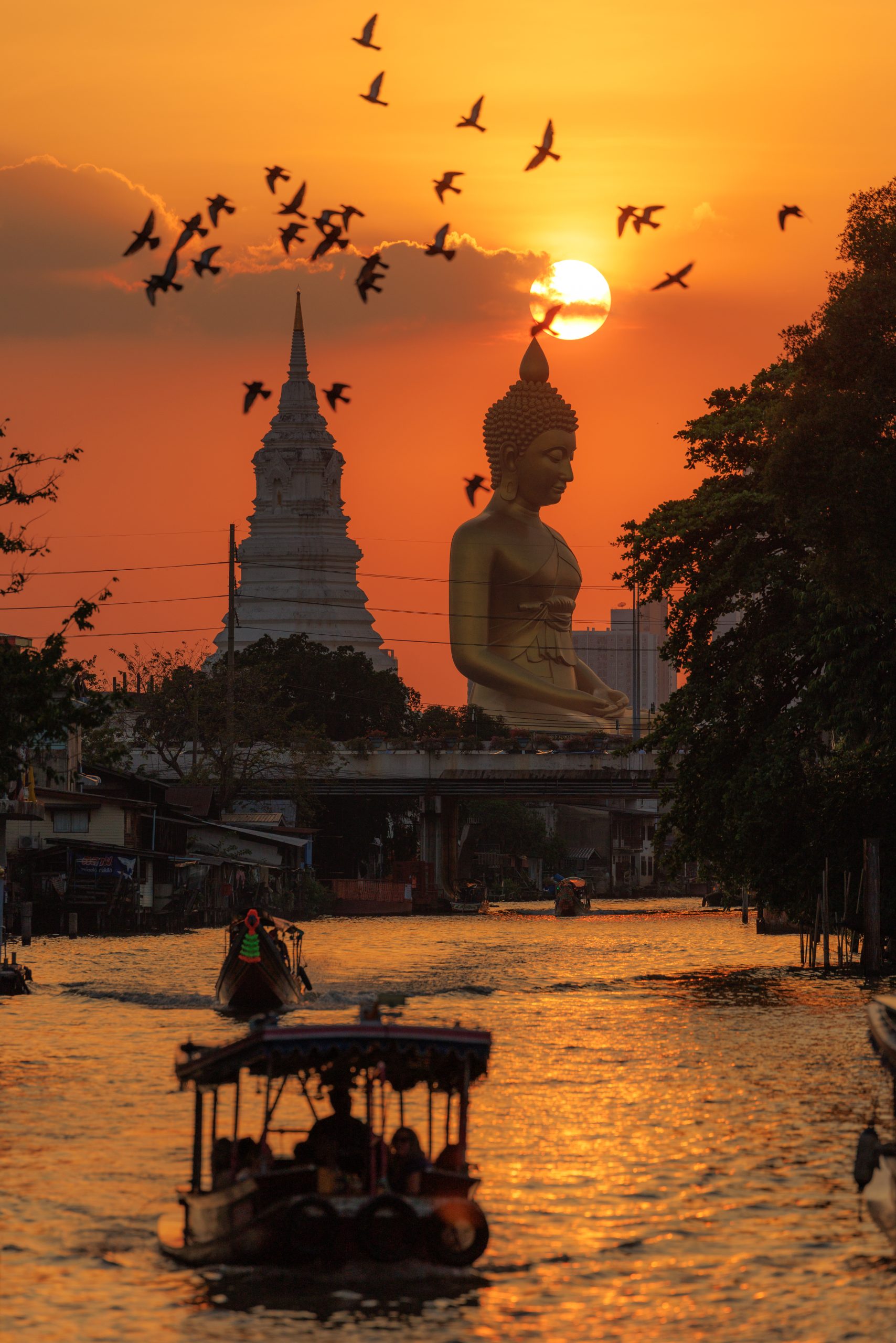 20 ก.พ. 69 #ThaiPBSPhoto บันทึกภาพดวงอาทิตย์ลับหลังพระพุทธธรรมกายเทพมงคล และพระมหาเจดีย์มหารัชมงคล วัดปากน้ำ ภาษีเจริญ แสงสีส้มทองสะท้อนคลองบางกอกใหญ่ เติมมิติยามเย็นของกรุงเทพฯ
