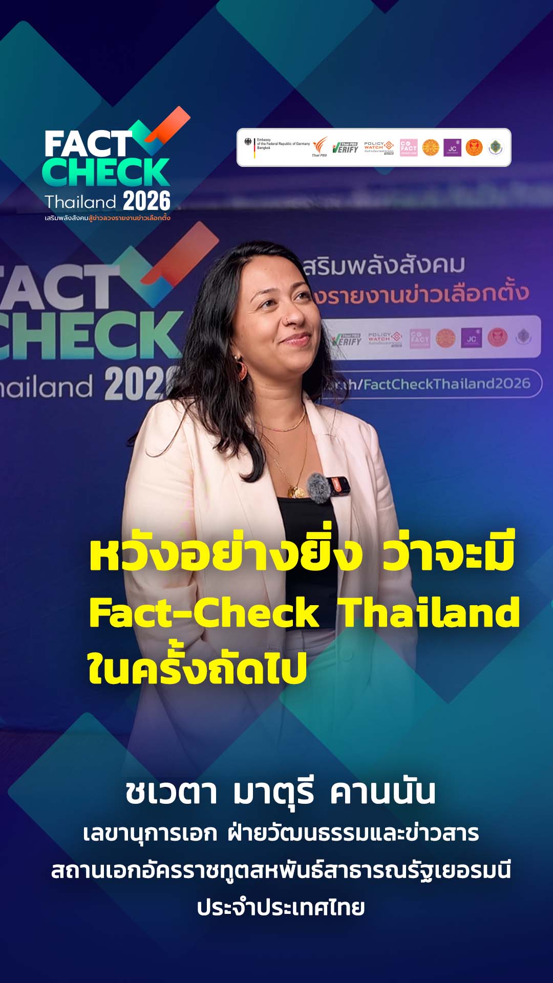 สถานเอกอัครราชทูตเยอรมนีประจำประเทศไทย มหาวิทยาลัยธรรมศาสตร์ ไทยพีบีเอส และ Cofact Thailand เชิญชวนประชาชนร่วมงาน “Talk for Truth และพิธีประกาศผล Fact-Check Thailand Award 2026” เวทีใหญ่ที่เปิดมุมมองสังคมไทยสู้ศึกข่าวลวงก่อนเลือกตั้งปี 2569 ในวันพฤหัสบดีที่ 18 ธันวาคม 2568 เวลา 12.00 - 16.30 น. ณ คอนเวนชันฮอลล์ อาคาร D ไทยพีบีเอส