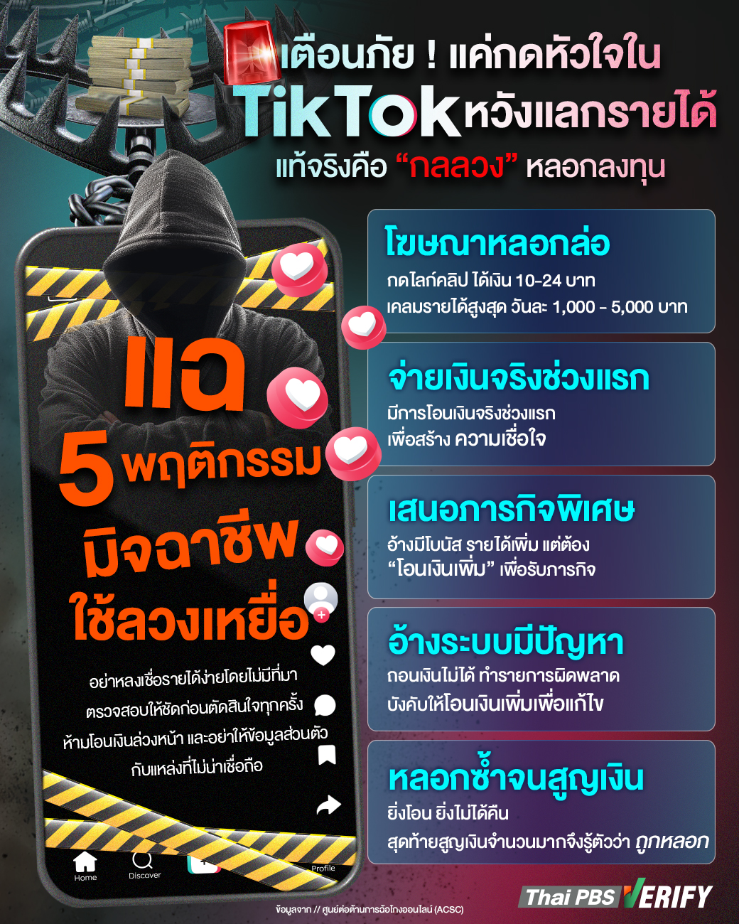 ตำรวจไซเบอร์ รวบมิจฉาชีพหลอกหารายได้ผ่าน TikTok ใช้กลลวง “กดหัวใจแลกเงิน” หลอกเหยื่อทำภารกิจกดไลก์ คนร้ายลวงด้วยการให้เงินจริงในช่วงแรก ก่อนชักชวนลงทุนผ่านลิงก์ปลอม อ้างเพิ่มรายได้และรับโบนัส สุดท้ายเหยื่อถูกเชิดเงินเกือบแสนบาท Thai PBS Verify เตือนภัยพร้อมเผยกลโกงก่อนตกเป็นเหยื่อมิจฯ