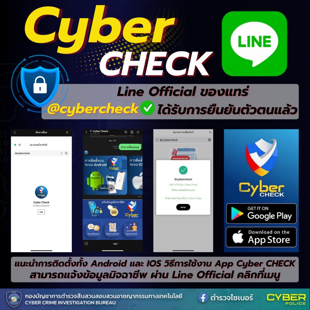 แอปฯ Cyber Check จากตำรวจไซเบอร์ ใช้ตรวจสอบเบอร์โทรศัพท์, หมายเลขบัญชีธนาคาร, LINE ID, Facebook, TikTok, และลิงก์ URL ของเว็บไซต์ต่าง ๆ