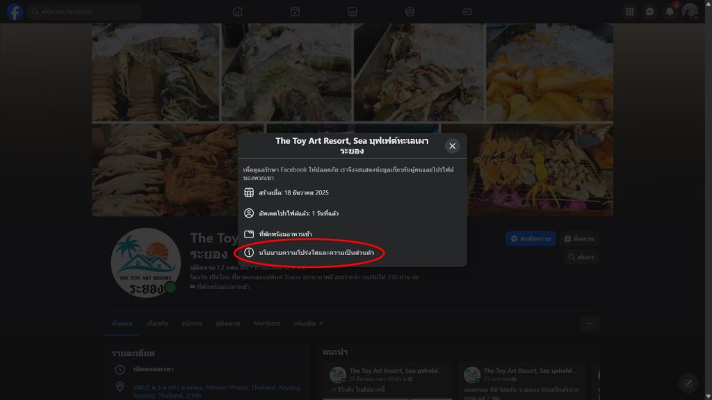 - การตรวจสอบความโปร่งใสของเพจ: สามารถกดดูได้ที่ชื่อของเพจดังกล่าว แล้วตรวจสอบที่ “นโยบายความโปร่งใส และความเป็นส่วนตัว” ซึ่งจะมีข้อสังเกตดังนี้
