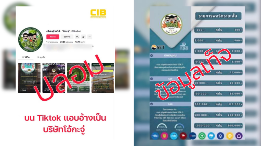 ตัวอย่างช่อง TikTok ปลอม ที่มีการยิงโฆษณาทางช่องทางออนไลน์เพื่อหลอกลวงเหยื่อให้หลงเชื่อว่ามีการเปิดให้ลงทุนหุ้นชื่อ “โอ้กะจู่”