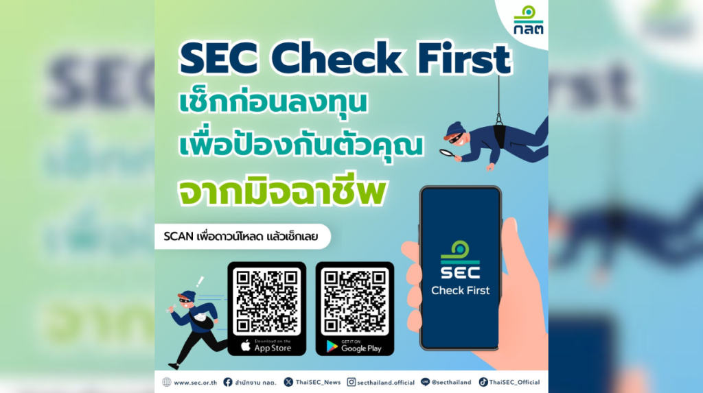 - ใช้แอปฯ “SEC Check First”: ของ ก.ล.ต. ตรวจสอบรายชื่อบริษัทและผู้แนะนำการลงทุนว่าได้รับอนุญาตจริงหรือไม่