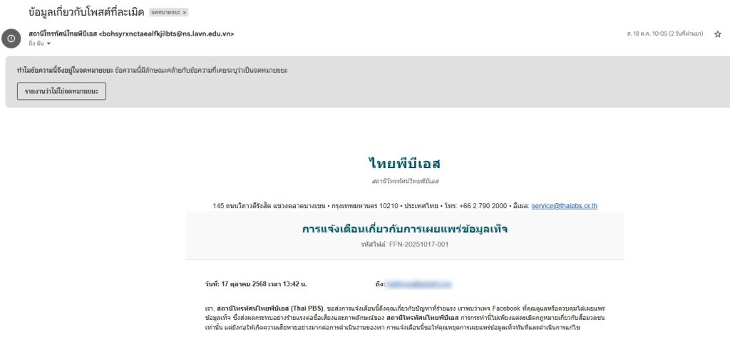 Thai PBS Verify ตรวจสอบพบ อีเมลอ้างชื่อ “สถานีโทรทัศน์ไทยพีบีเอส” พร้อมใช้หัวเรื่องคล้าย “การแจ้งเตือนเกี่ยวกับการเผยแพร่ข้อมูลเท็จ” หรือ “การแจ้งเตือนปัญหาสำคัญ” โดยมีเนื้อหาอ้างว่า