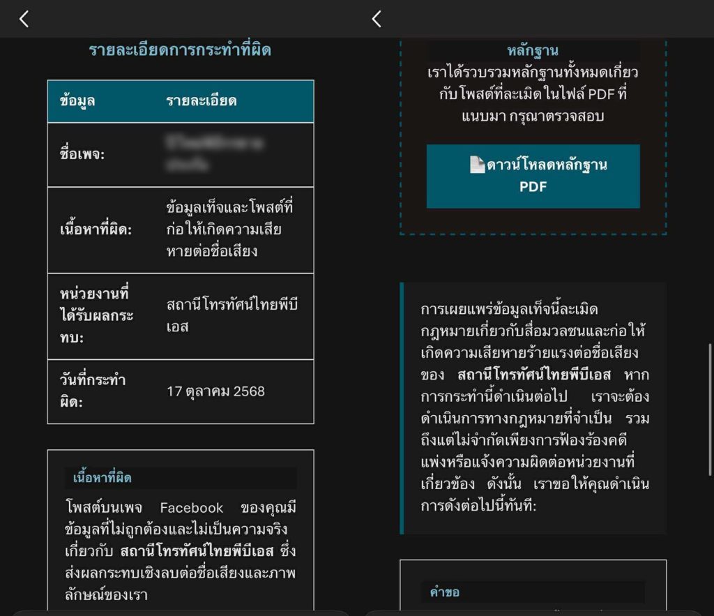 หรือควบคุมได้เผยแพร่ข้อมูลเท็จ ซึ่งส่งผลกระทบอย่างร้ายแรงต่อชื่อเสียงและภาพลักษณ์ของ สถานีโทรทัศน์ไทยพีบีเอส การกระทำนี้ไม่เพียงแต่ละเมิดกฎหมายเกี่ยวกับสื่อมวลชนเท่านั้น แต่ยังก่อให้เกิดความเสียหายอย่างมากต่อการดำเนินงานของเรา การแจ้งเตือนนี้ขอให้คุณหยุดการเผยแพร่ข้อมูลเท็จทันทีและดำเนินการแก้ไข