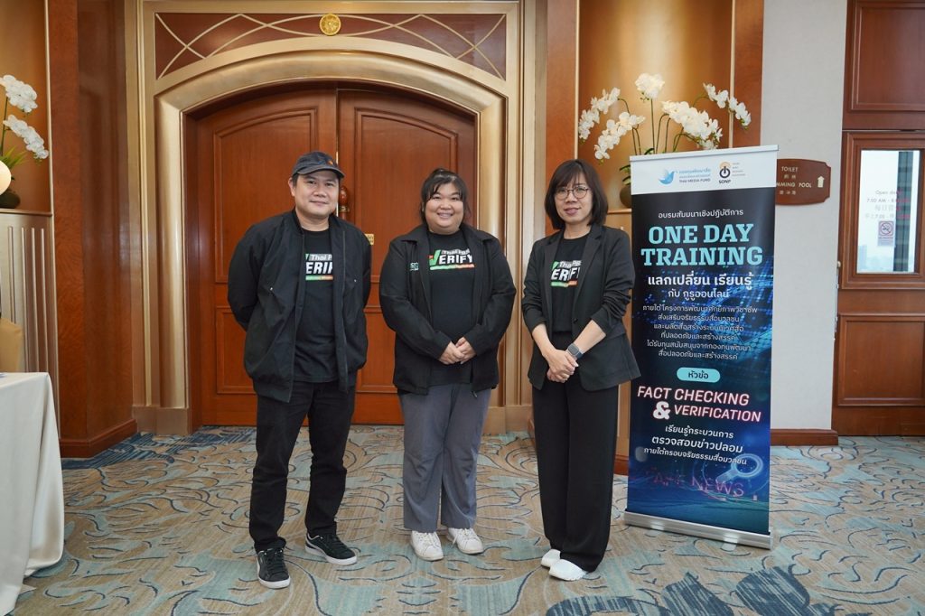 ขณะที่ ทีม Thai PBS Verify ยังได้เป็นผู้ถ่ายทอดความรู้เรื่องการ Fact-Check หรือการตรวจสอบข่าวปลอม โดยหนึ่งในหัวใจสำคัญของการอบรม คือการฝึกใช้เครื่องมือ Reverse Image Search การตรวจสอบด้วยเครื่องมือตรวจสอบต่าง ๆ ไม่ว่าจะเป็นการใช้ เครื่องมือตรวจสอบภาพ AI จากเว็บไซต์ต่าง ๆ การใช้แผนที่ Google Maps เพื่อตรวจสอบแผนที่รวมไปถึง การสังเกต เพื่อค้นที่มาของภาพว่าถูกนำมาจากเหตุการณ์ใด เคยปรากฏที่ไหนมาก่อน หรือถูกนำมาบิดเบือนบริบทหรือไม่ ซึ่งเป็นทักษะจำเป็นในยุคที่ภาพจากต่างประเทศหรือภาพที่สร้างด้วย AI ที่ถูกนำมาอ้างเป็นเหตุการณ์จริงบ่อยครั้ง