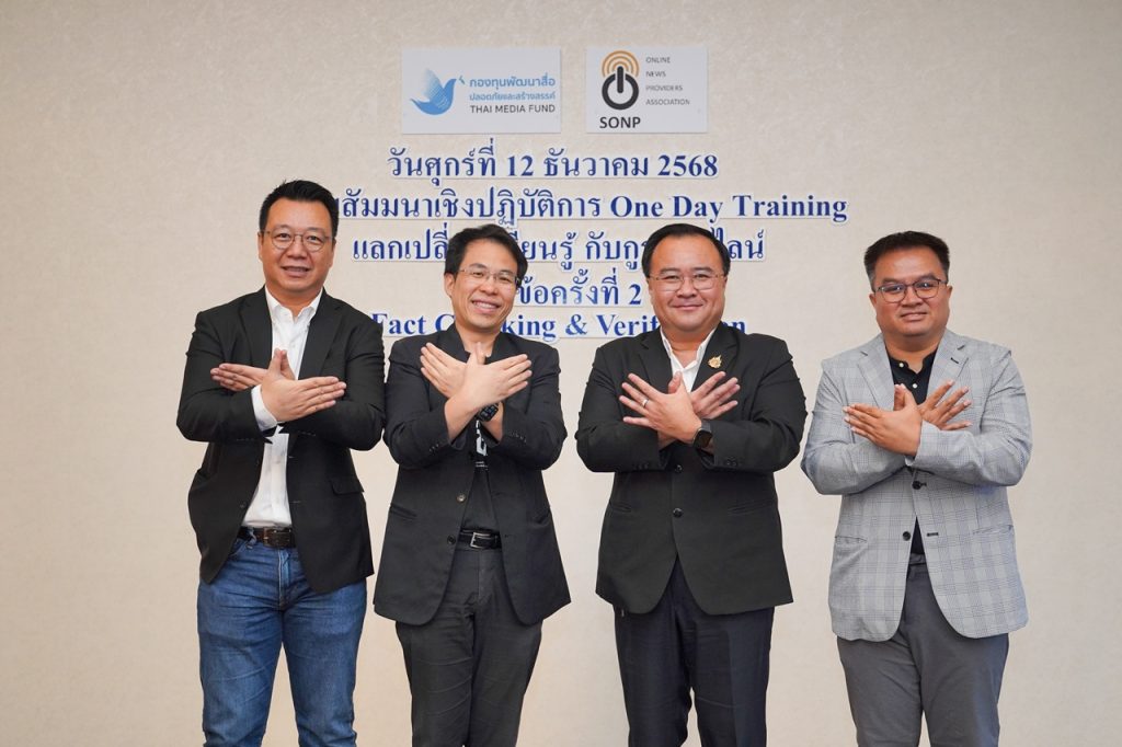 สมาคมผู้ผลิตข่าวออนไลน์ (SONP) โดยการสนับสนุนจากกองทุนพัฒนาสื่อปลอดภัยและสร้างสรรค์ จัดอบรม One Day Training ประจำปี 2568 ครั้งที่ 2 หัวข้อ “Fact Checking & Verification เรียนรู้กระบวนการตรวจสอบข่าวปลอม ภายใต้กรอบจริยธรรมสื่อมวลชน” เมื่อวันที่ 12 ธ.ค. 68 ที่ผ่านมา โดยมีเป้าหมายให้สื่อมวลชนและผู้ปฏิบัติงานด้านข่าวออนไลน์ มีเครื่องมือและกรอบคิดเพียงพอในการรับมือกับข่าวลวงที่ซับซ้อนขึ้นทุกวัน