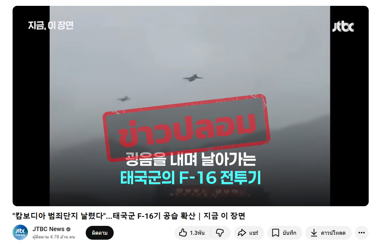 โพสต์ของชื่อสื่อเกาหลีใต้ รายงานด้วยการนำคลิป AI ซึ่งเหมือนจริงจนสื่อหลักของเกาหลีใต้นำไปรายงานข่าว อ้างไทยใช้เครื่องบินขับไล่ F-16 โจมตีอาคารแห่งหนึ่งในกัมพูชา เผยแพร่เมื่อวันที่ 11 ธ.ค. 68 มียอดเข้าชม 443,600 ครั้ง