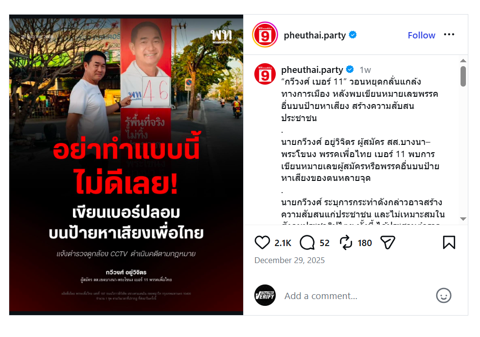 ภาพจาก: พรรคเพื่อไทย ระบุผู้สมัคร สส.พรรคเพื่อไทยถูกดัดแปลงป้ายหาเสียงโดยการเขียนทับหมายเลขผู้สมัครปลอม