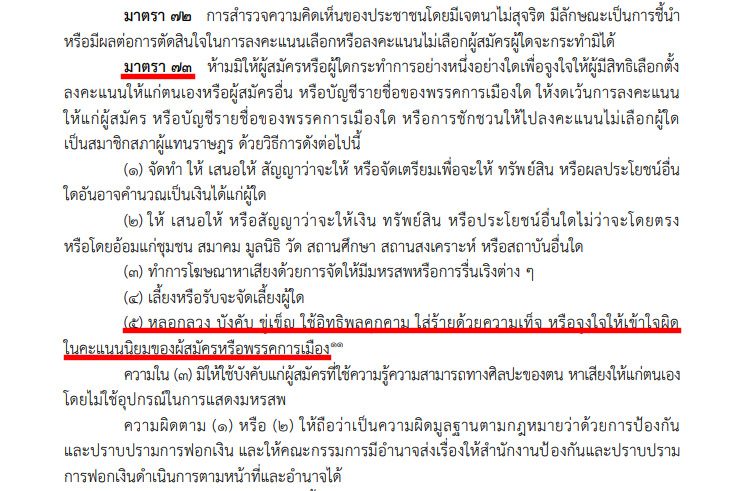 “มาตรา ๗๓ ห้ามมิให้ผู้สมัครหรือผู้ใดกระทำการอย่างหนึ่งอย่างใดเพื่อจูงใจให้ผู้มีสิทธิเลือกตั้ง ลงคะแนนให้แก่ตนเองหรือผู้สมัครอื่น หรือบัญชีรายชื่อของพรรคการเมืองใด ให้งดเว้นการลงคะแนนให้แก่ผู้สมัคร หรือบัญชีรายชื่อของพรรคการเมืองใด หรือการชักชวนให้ไปลงคะแนนไม่เลือกผู้ใด เป็นสมาชิกสภาผู้แทนราษฎร ด้วยวิธีการดังนี้