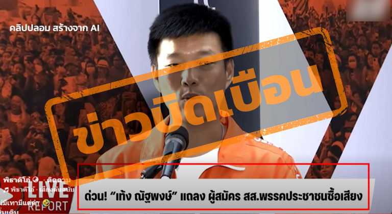 โพสต์อ้างคลิป เท้ง ณัฐพงษ์ แถลงเรื่องผู้สมัคร สส.พรรคประชาชนซื้อเสียง ซึ่งตรวจสอบพบเป็นเพียงคลิปที่สร้างจาก AI Deepfake