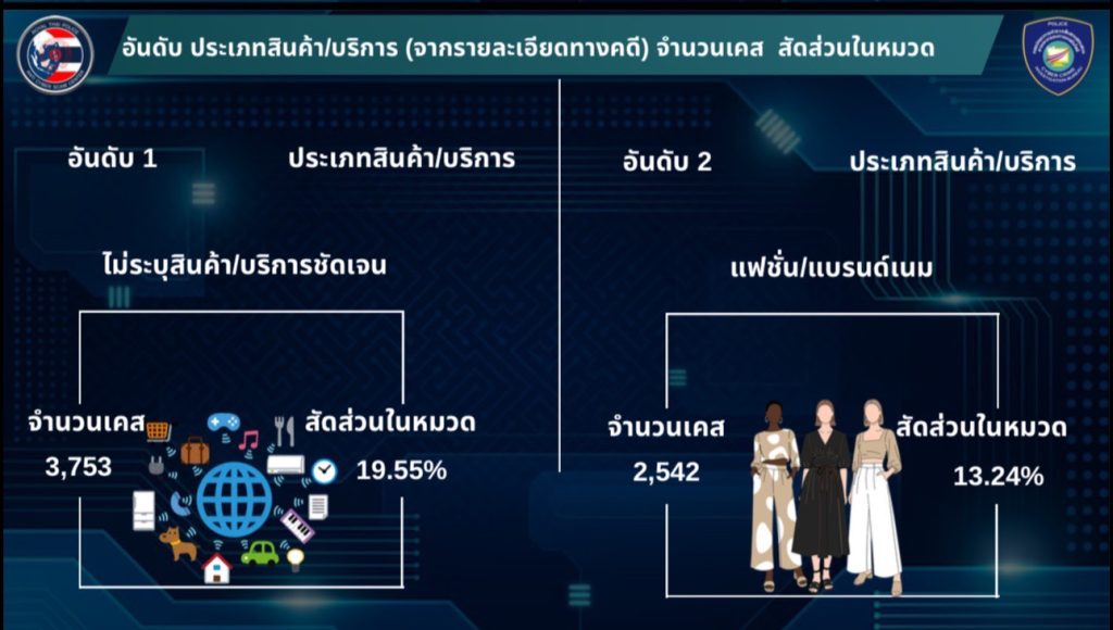 รูปแบบการหลอกนี้ยังพบว่าจำนวนคดีมากที่สุด เป็นการหลอกซื้อสินค้าทั่วไปกว่า 3,753 เคส ขณะที่สินค้าแฟชั่น/แบรนด์เนม และอาหาร/เครื่องดื่ม รองลงมาตามลำดับ ซึ่งพบโปรไฟล์ปลอมที่ใช้ซ้ำมากที่สุดชื่อ “โดนัททท นัท” ขายบัตรคอนเสิร์ต จำนวน 23 เคส มูลค่าความเสียหายกว่า 2.2 แสนบาท