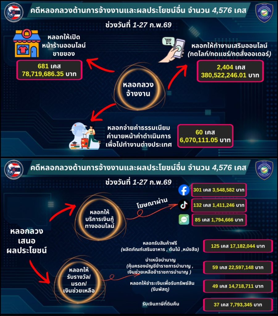 - หลอกให้ทำงานเสริมออนไลน์ (กดไลก์/กดแชร์/กดสั่งออเดอร์) มีจำนวน 2,404 เคส มูลค่าเสียหายกว่า 380 ล้านบาท