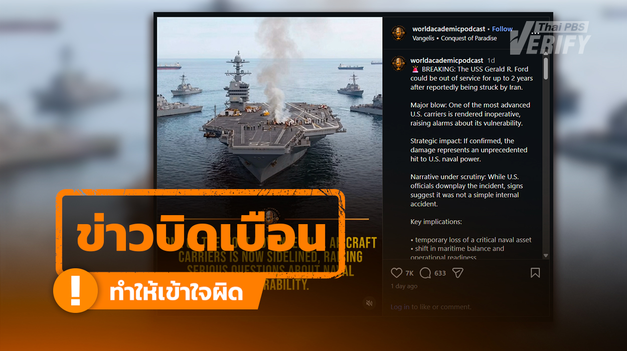 โพสต์อ้าง เรือ “เจอรัลด์ ฟอร์ด” ถูกส่งซ่อม 2 ปี เหตุถูกโจมตีจาก “อิหร่าน” แท้จริงเรือไฟไหม้ในห้องซักรีด